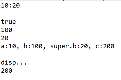System.out.println("a:"+a+", b:"+b+", super.b:"+super.b+", c:"+c);