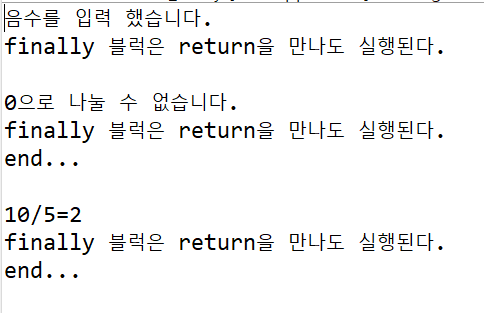 System.out.println("예외발생 여부와 상관 없이 실행 됩니다.");