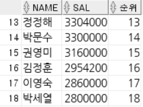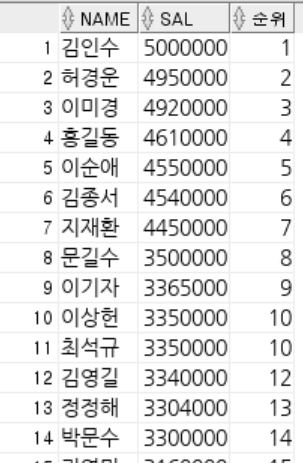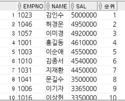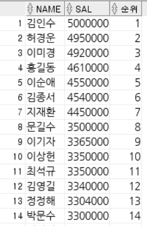 SELECT name, sal, ROW_NUMBER() OVER( ORDER BY sal DESC) 순위 FROM emp;