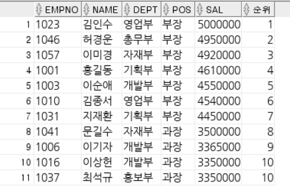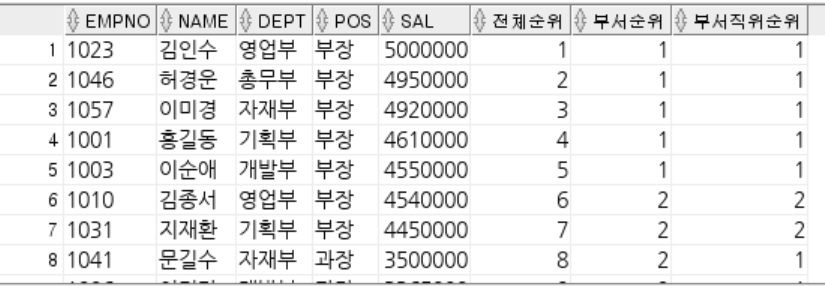 RANK() OVER( PARTITION BY dept, pos ORDER BY sal DESC ) 부서직위순위