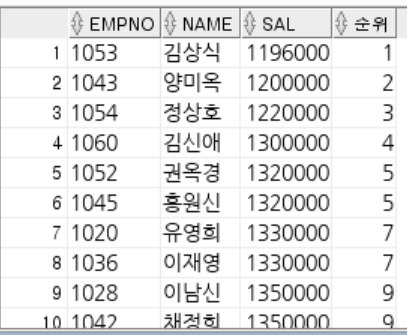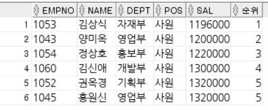 SELECT empNo, name, sal, RANK() OVER(ORDER BY sal) 순위 FROM emp;