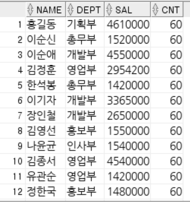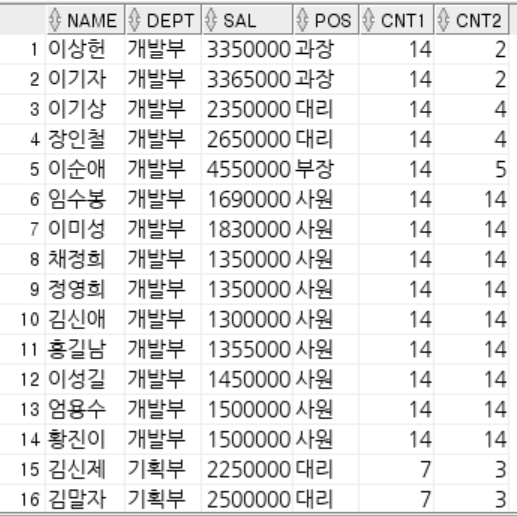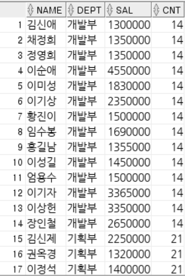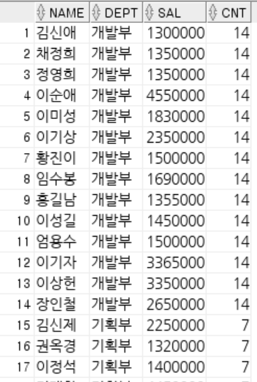 동일부서에는 동일한 인원의 합계가 출력된다. 개발부에는 14명이 존재하고 기획부에는 (21-14) 7명이 존재함.