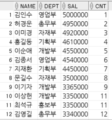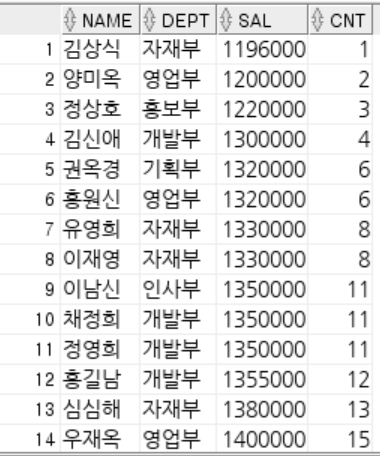 COUNT는 누적되는 것이고 같은 sal을 가지고 있으면 COUNT(같은 sal의 수를 출력하되 계속 누적됨) 위에 보는 것 처럼 11이 두명에게서 보인다.