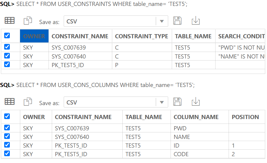 SELECT * FROM USER_CONS_COLUMNS WHERE table_name= 'TEST5'; -- 확인용