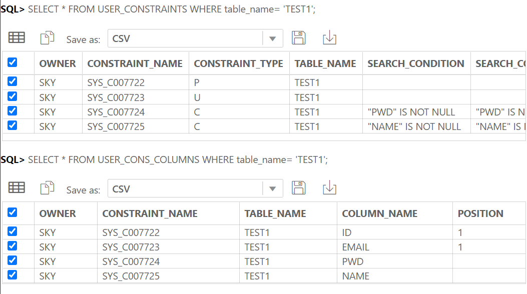 SELECT * FROM USER_CONS_COLUMNS WHERE table_name= 'TEST1';