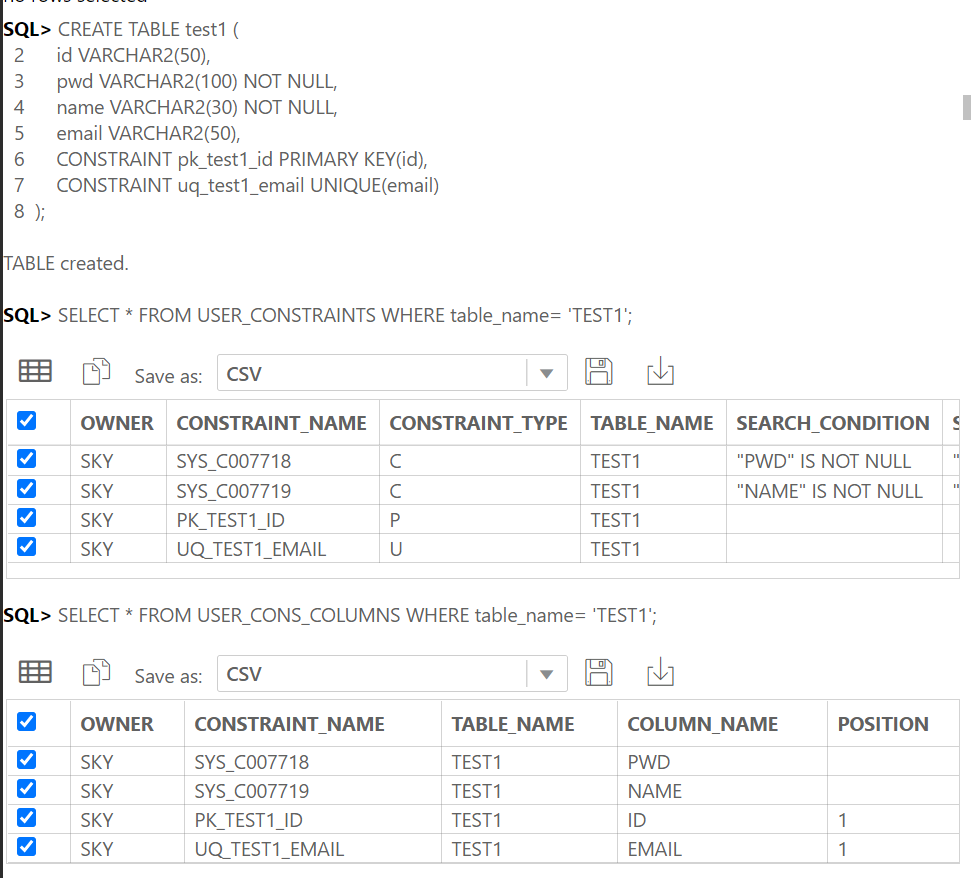 CONSTRAINT [제약조건명] 을 통해 기본키와 UNIQUE에 이름을 주어서 SELECT * FROM USER_CONSTRAINT WHERE table_name = 'TEST1'; 을 통해 알아볼 수 있었다. 이 명령어를 통해 보면 CONSTRAINT_TYPE에 P가 PRIMARY KEY를 나타내고, U가 UNIQUE를 나타낸다. C는 CHECK 제약조건.