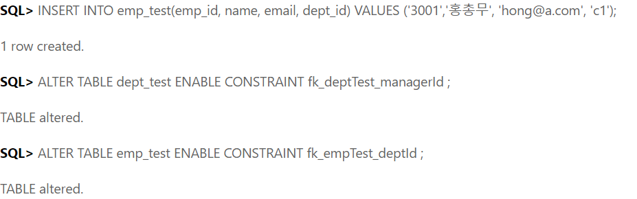 emp_id가 3001인 자료를 추가하고 나서 제약조건을 활성화 시키는 명령어를 입력하자,