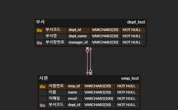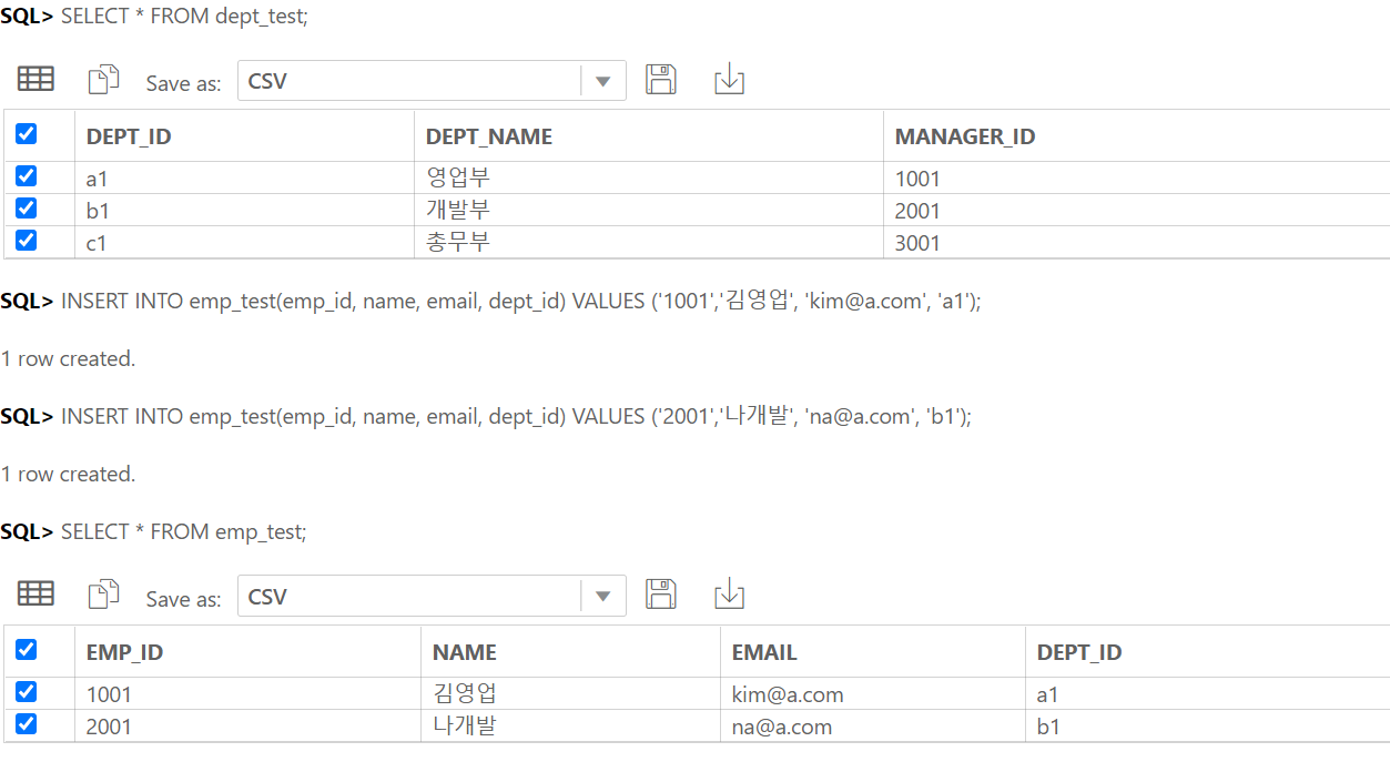 dept_test 테이블에는 manager_id로 3001이 있는데 이는 emp_test의 테이블의 emp_id를 참조하는 키 이기 때문이다. 따라서 emp_test 테이블에 emp_id가 3001인 자료가 있어야한다.