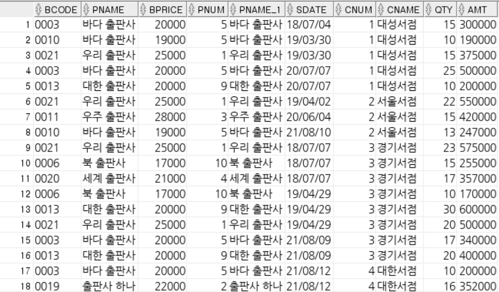 -- 출력목록 : 책코드(bCode), 책이름(bName), 책가격(bPrice), 출판사번호(pNum), 출판사이름(pName), 판매일자(sDate), 판매고객번호(cNum), 판매고객이름(cName), 판매수량(qty), 금액(bPrice * qty)