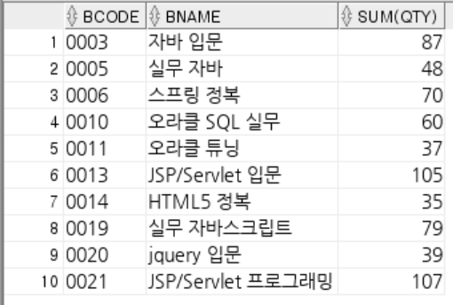 SUM() 을 사용할 때 GROUP BY를 넣어서 책코드와 책이름을 묶어주어야 한다.