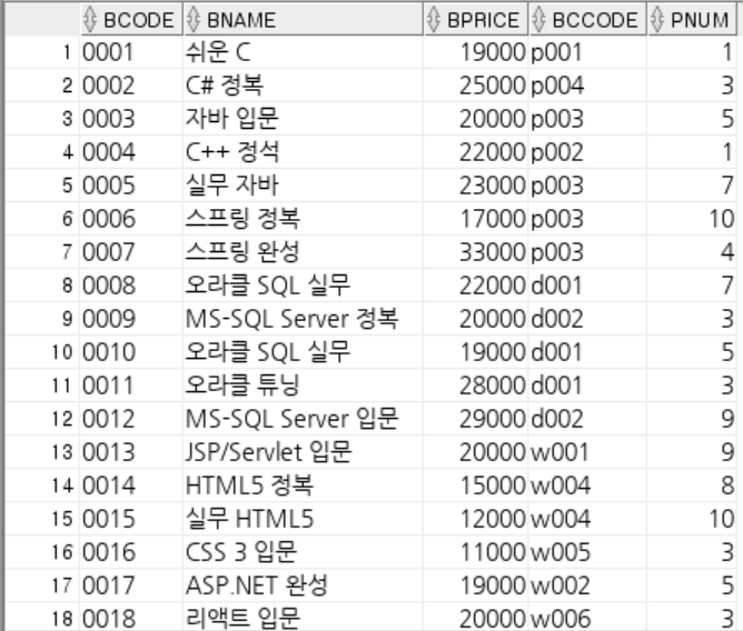 -- bCode, bName, bPrice, bcCode, bNum(책코드, 책이름, 가격, 분류코드, 출판사번호)