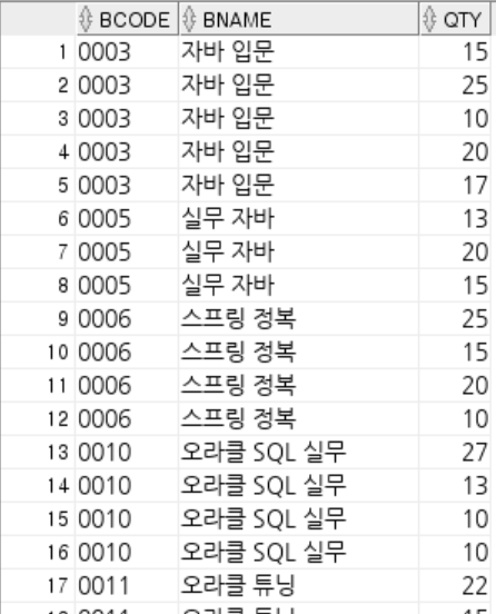 -- 판매된 책코드(bCode), 책이름(bName), 판매수량의 합(qty) : 책코드 오름차순