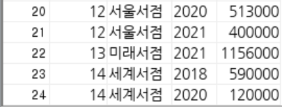 cNum을 보면 숫자가 다른데, 서울서점의 이름인 곳이 중복적으로 있었음을 확인할 수 있다.