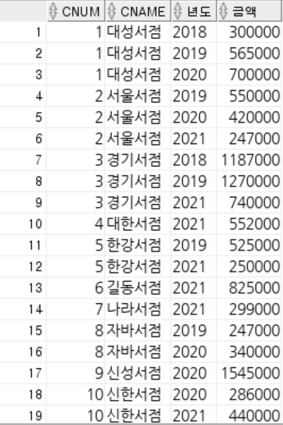 - 고객번호(cNum), 고객이름(cName), 년도, 판매금액합 : 고객번호오름차순, 년도오름차순