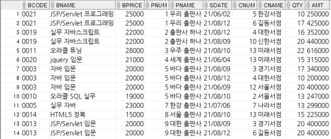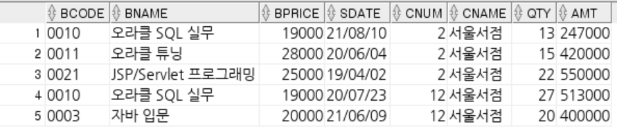 -- 판매현황 : 책코드(bCode), 책이름(bName), 책가격(bPrice), 출판사번호(pNum), 출판사이름(pName), 판매일자(sDate), 판매고객번호(cNum), 판매고객이름(cName), 판매수량(qty), 금액(bPrice * qty)