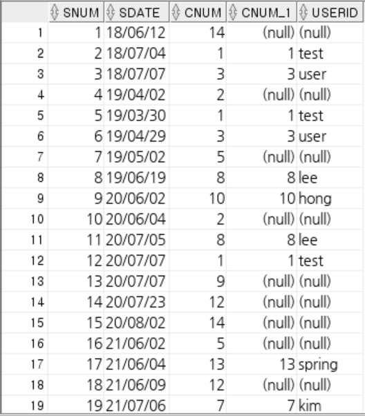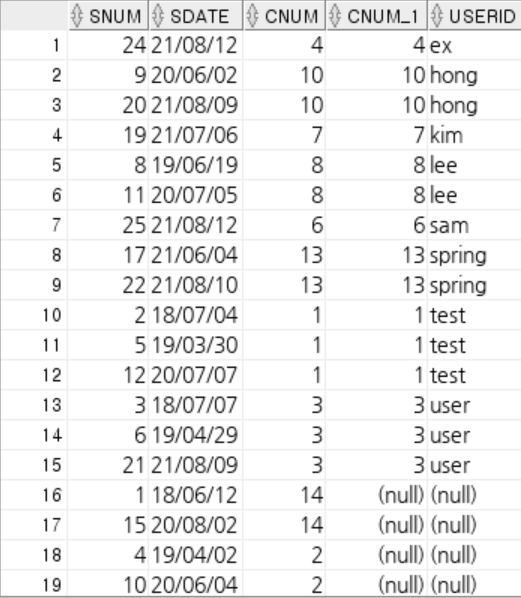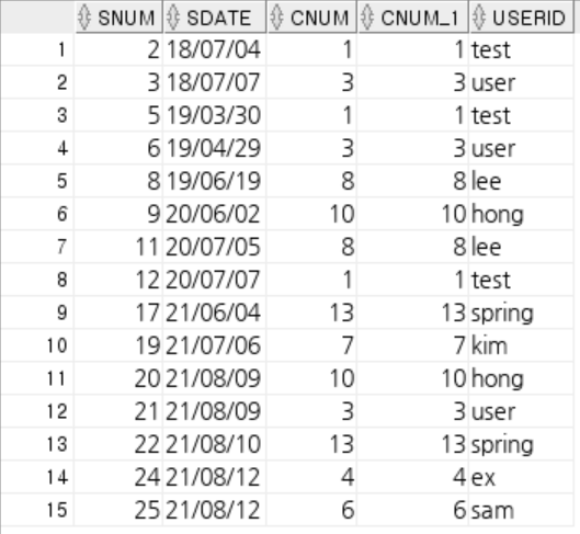 sNum, sDate, cNum, cName, userId를 출력하시오.