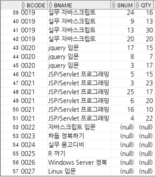 그냥 EQUI JOIN은 book 테이블과 dsale의 테이블의 교집합만을 구하므로, 팔린 책들만 나오는 것을 볼 수 있다.