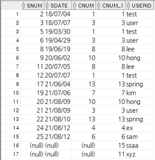 FULL OUTER JOIN member m ON s.cNum = m.cNum;