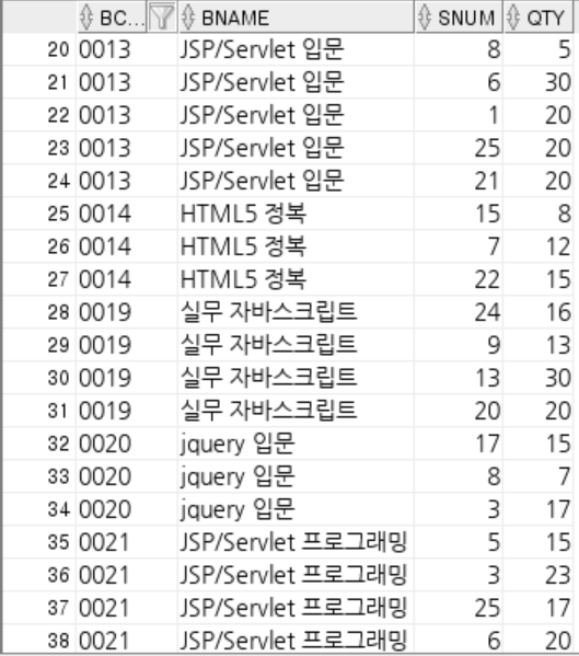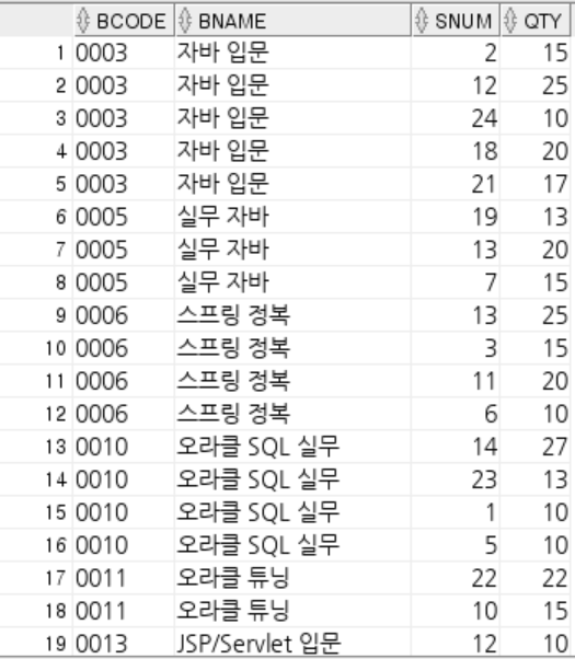 SELECT b.bCode, bName, sNum, qty