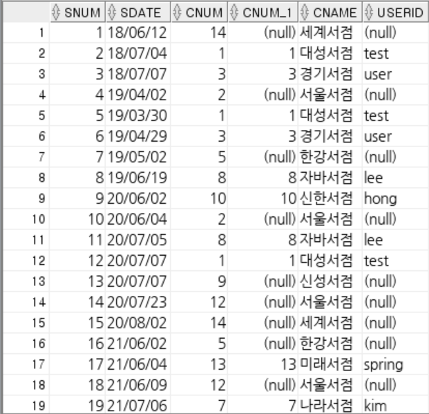 sale 테이블에 있는 자료는 모두 나오되, 회원은 구매한 회원만 나와야 하므로 LEFT OUTER JOIN을 통해 쿼리를 작성하면 결과를 얻을 수 있다.