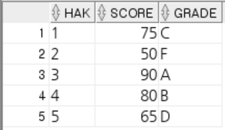 INSERT INTO grade1 ( grade, score ) VALUES ('C', 70);