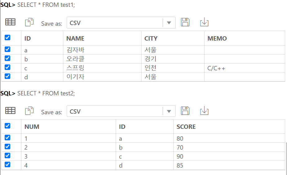 INSERT INTO test1(id, name, city, memo) VALUES ('b', '오라클', '경기', NULL);