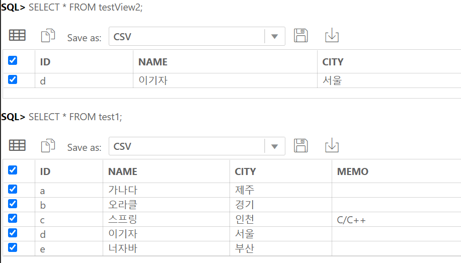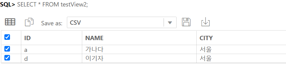 UPDATE testView2 SET city = '제주' WHERE id = 'd';