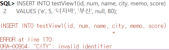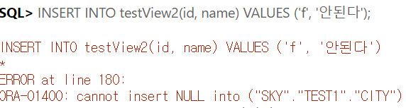 INSERT INTO testView2(id, name) VALUES ('f', '안된다');