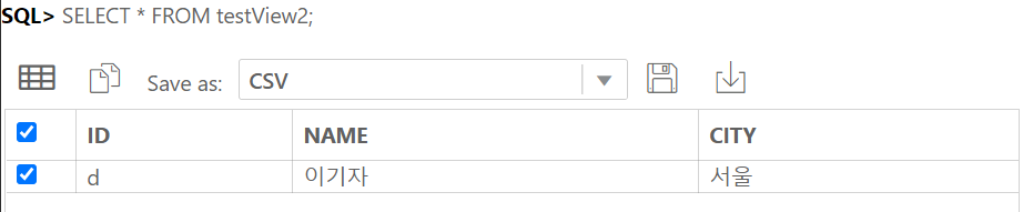 단순뷰는 제약 조건을 위반하지 않으면 추가가 가능하다. 위 테이블의 경우 id, name, city가 모두 NOT NULL이므로 값이 다 입력되어야 하는 제약조건이 있다. INSERT할 때 제약조건을 만족했으므로 데이터의 추가가 잘 되었다.