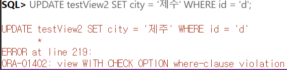WITH CHECK OPTION이 '서울'인 것을 바꾸지 못하게 설정해놨으므로 city를 바꿀 수 없다.