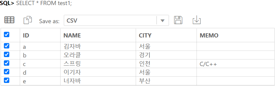 INSERT INTO test1(id, name, city, memo) VALUES ('a', '김자바', '서울', NULL);