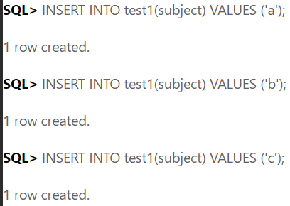INSERT INTO test(subject) VALUES ('d'); -- 3 d 추가