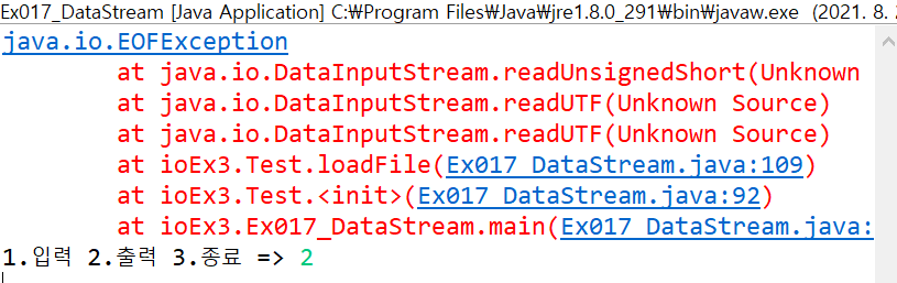 실행 시 EOFException 발생한 것을 볼 수 있다.
