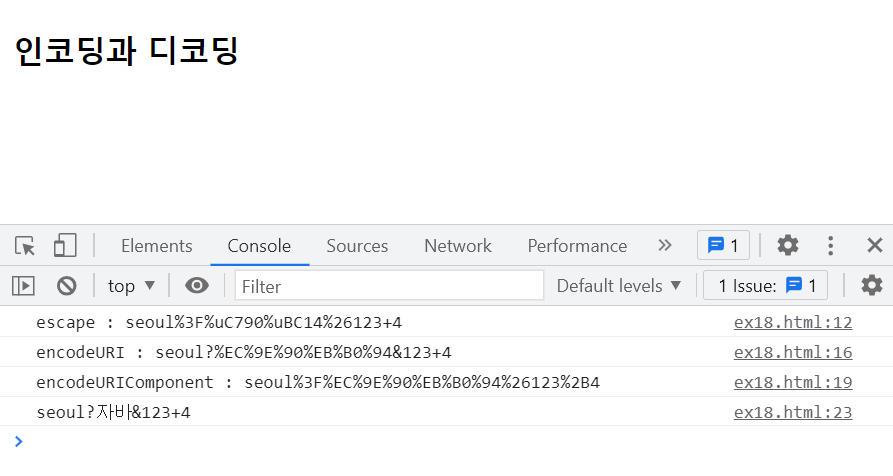 console.log("escape : " + out); // seoul%3F%uC790%uBC14%26123+4