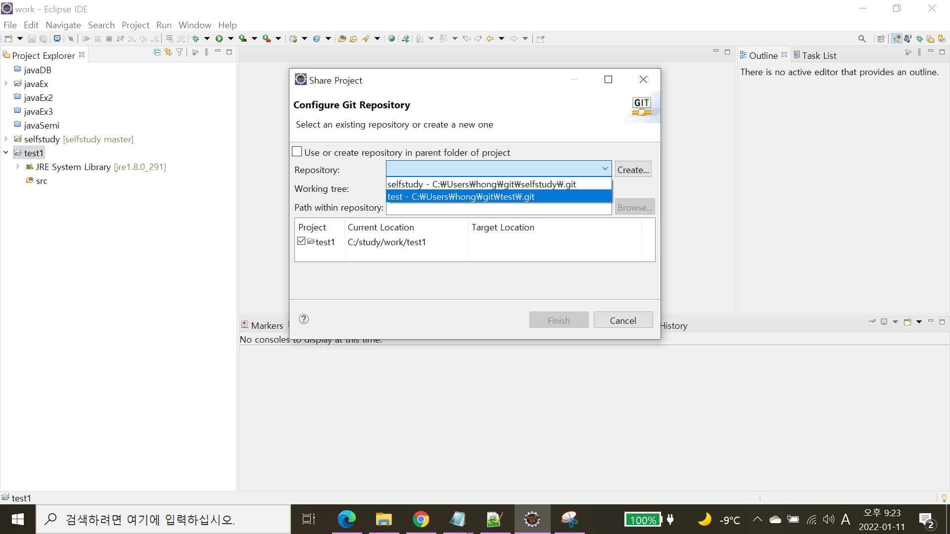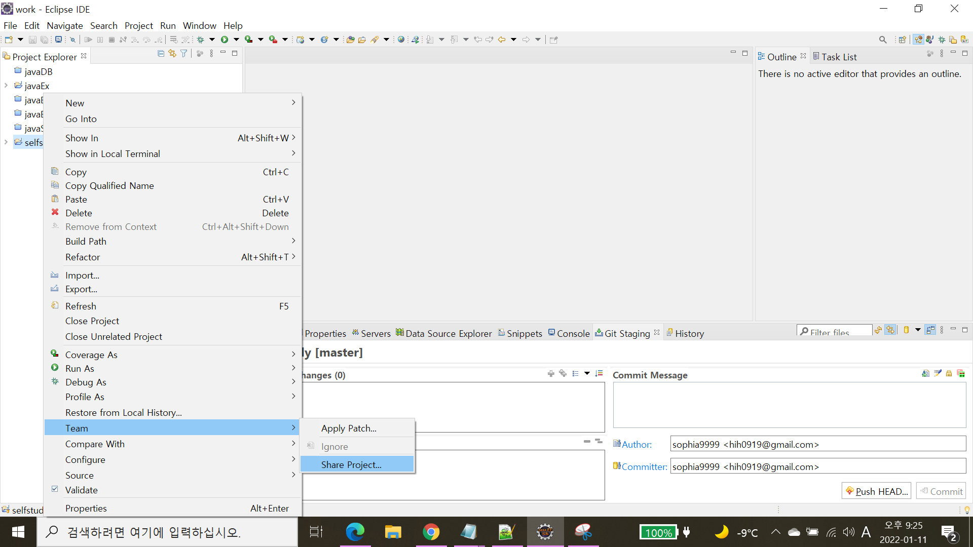 5) 만든 자바프로젝트를 오른쪽 클릭 후 Team -> Share Project를 누른다.