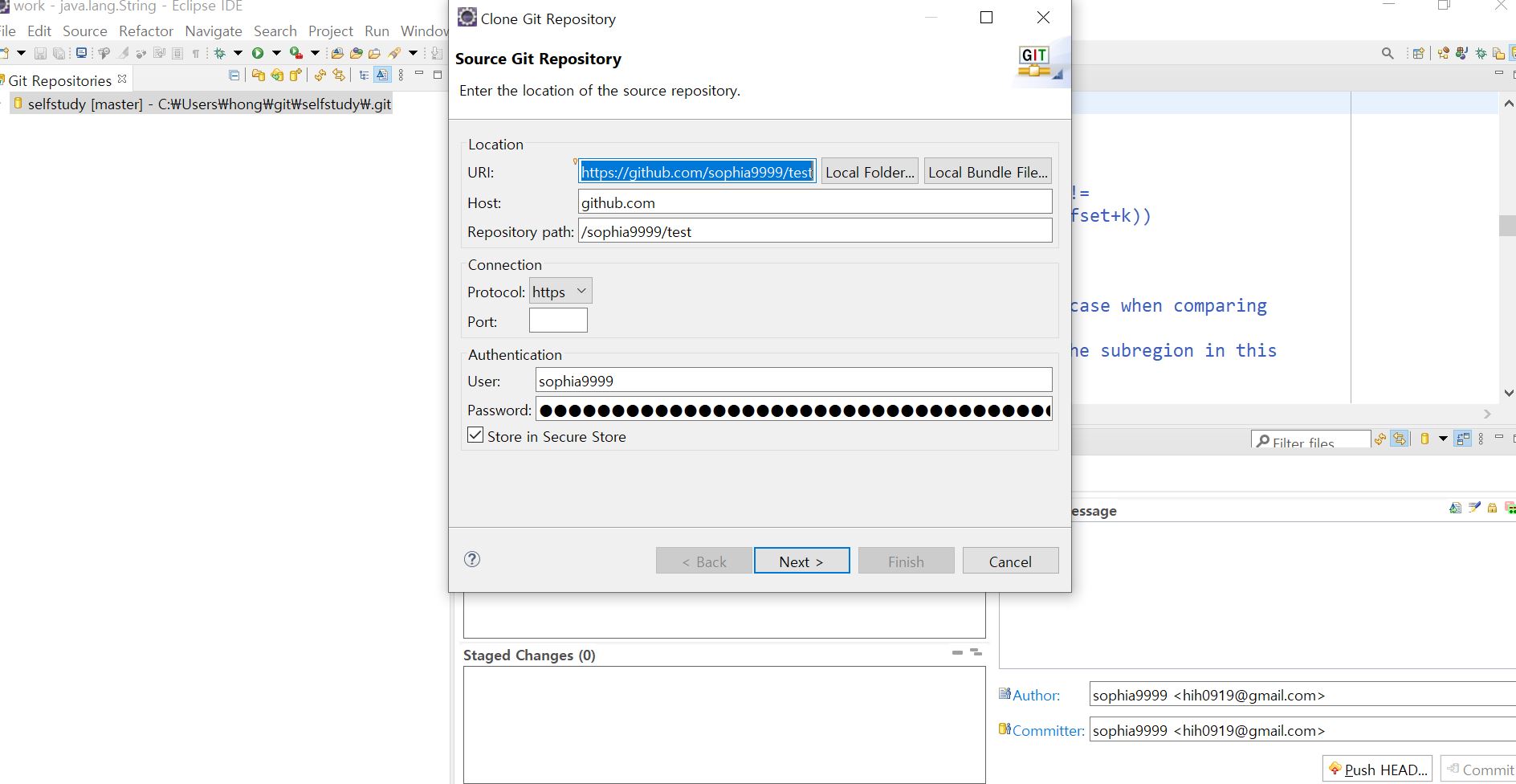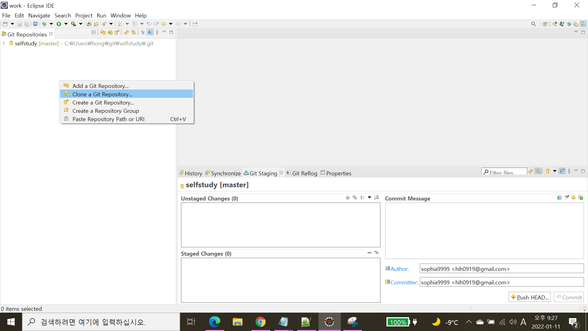 3) 새로운 아이콘이 Perspective 가 모여있는 곳에 생기는데, 거기서 Clone a Git Repository 를 누르고 1에서 만든 git Repository 주소를 넣는다.