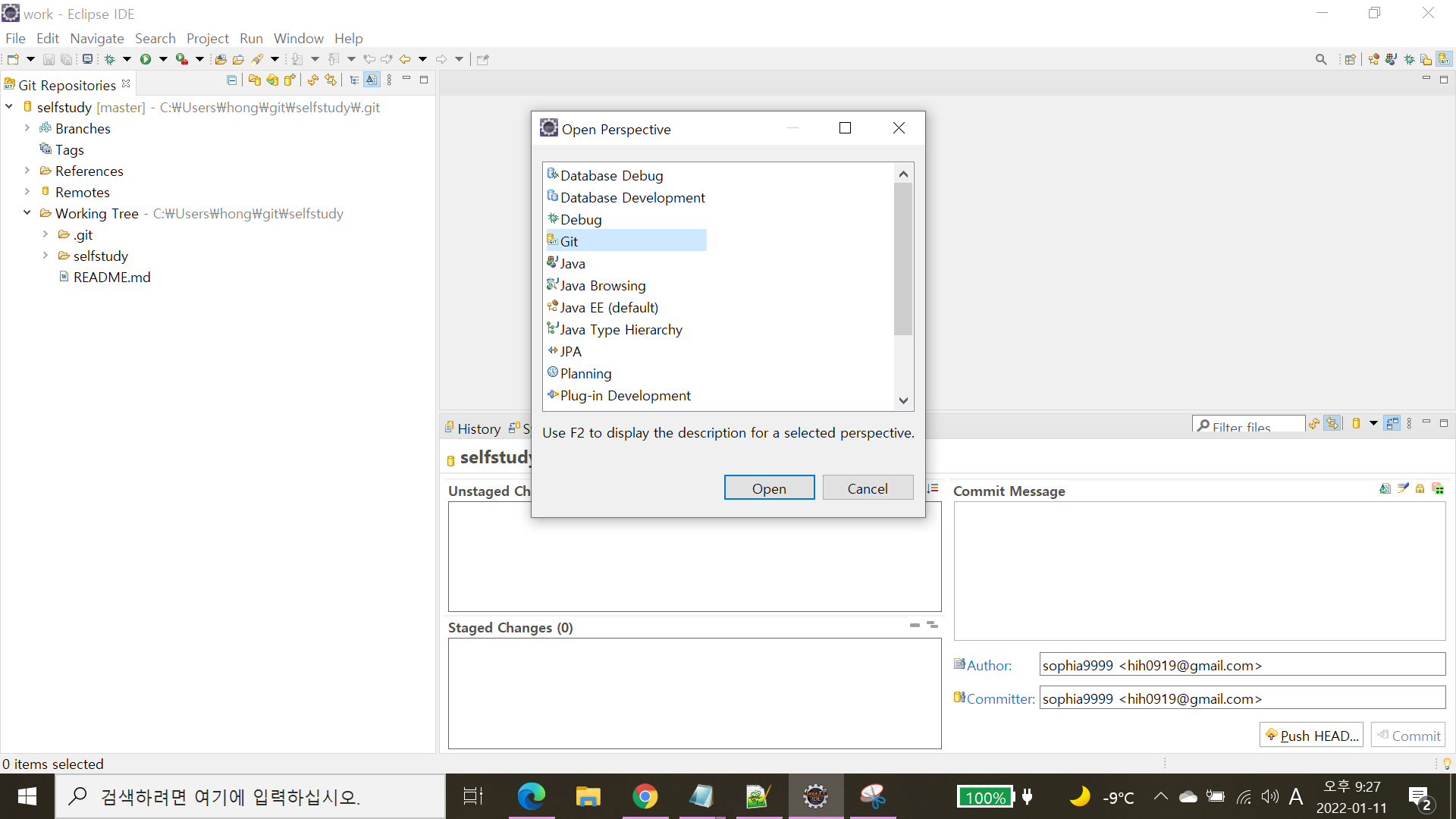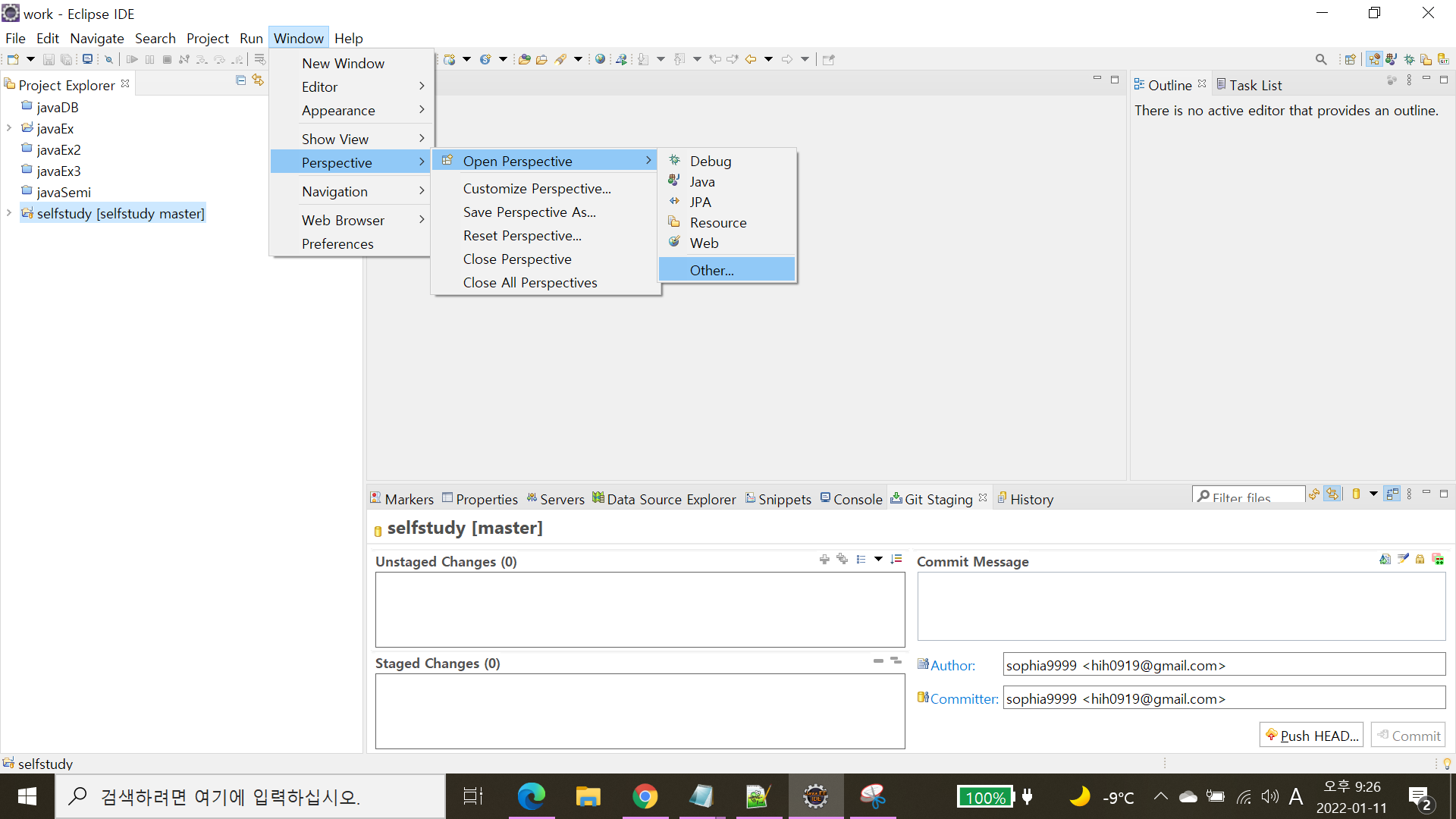 2) 이클립스에 Window -> perspective -> other 에 들어가 Git을 누른다.