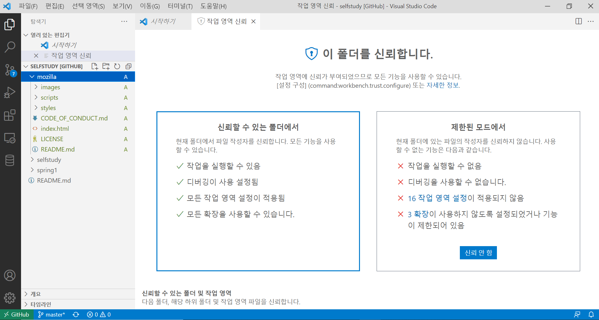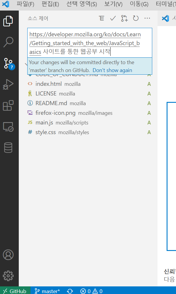 왼쪽 맨 밑에도 GitHub 라고 뜨고 작업폴더 옆에도 GitHub 라고 떠있는 것을 확인 할 수 있다.