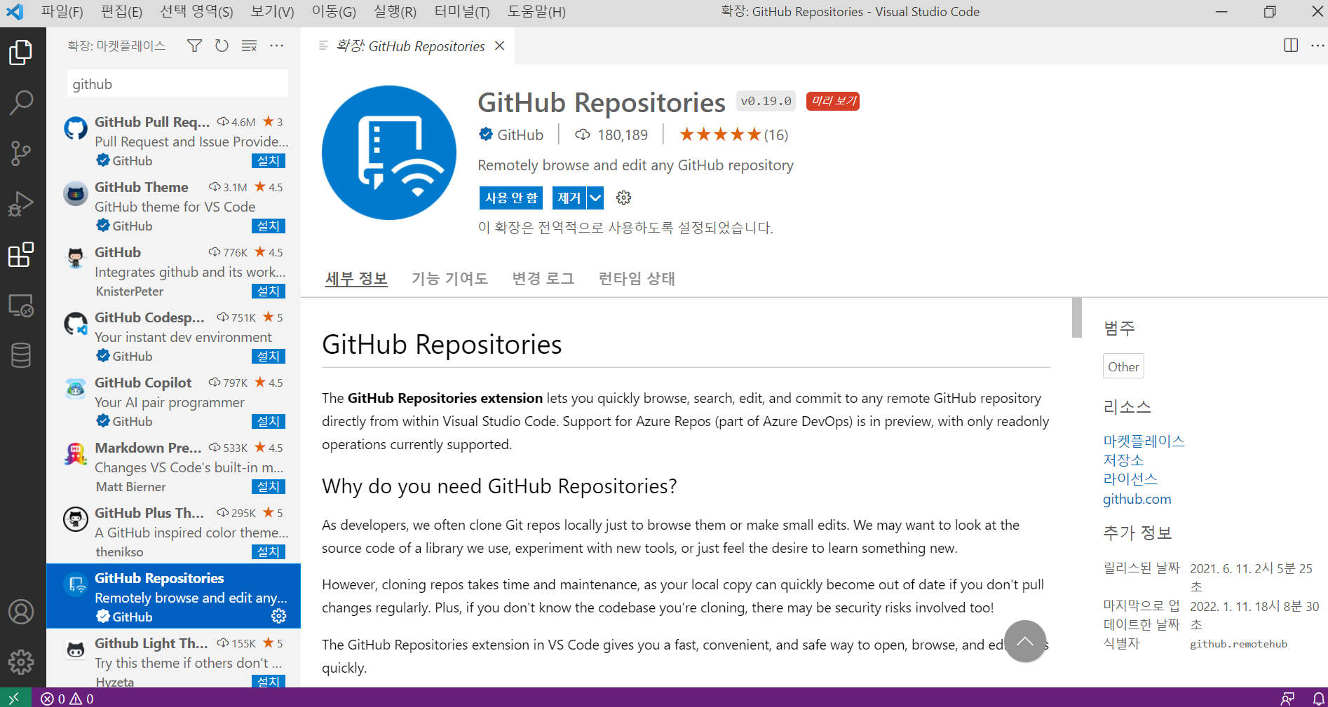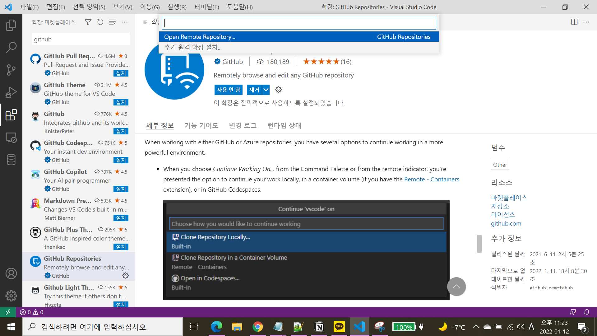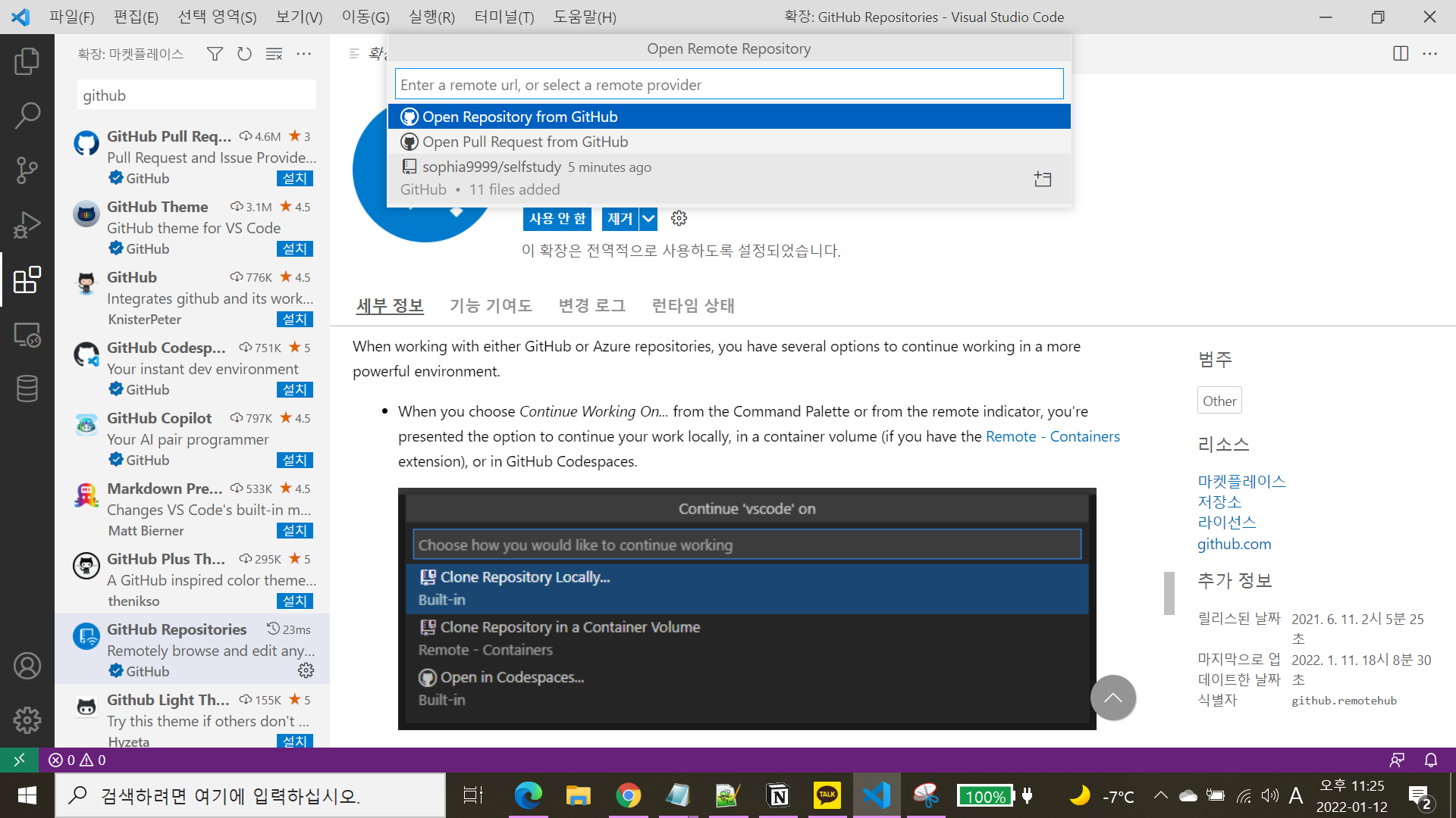 2. 확장으로 들어가 Github를 검색해 GitHub Repositories 를 다운로드 한다.