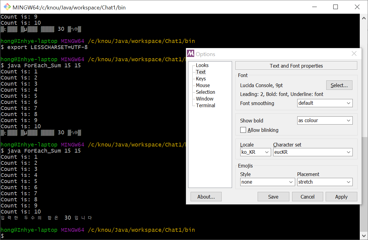 Java도 인코딩 다 UTF-8로 설정했는데, 자꾸 git bash 에서 깨져서 나와서 왜그러지 싶었는데,