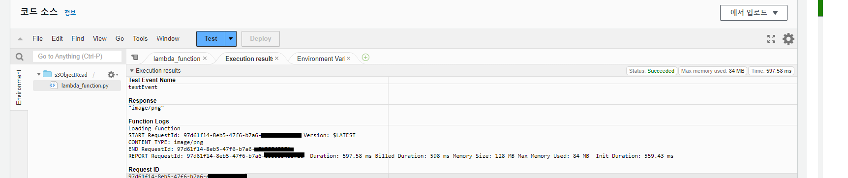 그냥 저의 S3 버킷에서 위에 써놓은 파일을 읽어서 Content-type을 보여주는 간단한 프로그램이라서 아무 파라미터 없이 테스트 누르시면 됩니다.