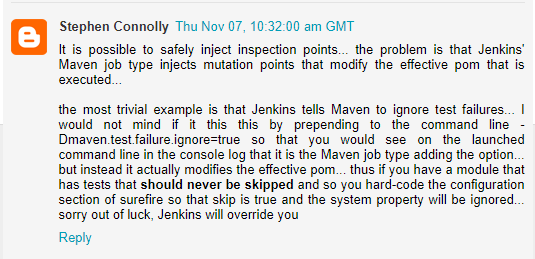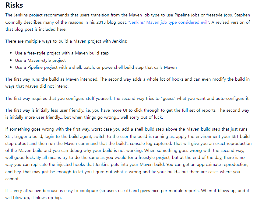 Jenkins 프로젝트는 사용자들이 Maven 작업 유형에서 Pipeline 작업 또는 프리스타일 작업으로 전환할 것을 권장합니다. 이는 2013년 Stephen Connolly의 블로그 게시물 "Jenkins' Maven job type considered evil"에서 설명된 여러 이유 때문입니다.