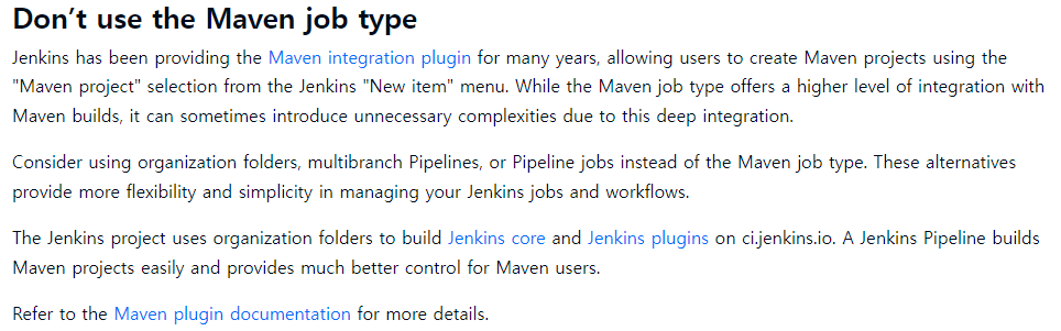 따라서, maven job type을 사용하지 말라고 하고 있다.