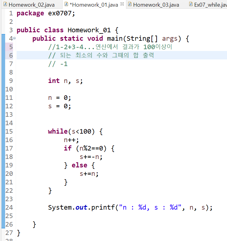 | 0707_Ex05_while : 양의 정수를 입력 받아 입력받은 정수까지 홀수합구하기 (0) | 2021.07.07 |