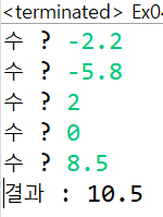 | 0709_Ex01_break : 실수를 입력 받아 입력 받은 수들의 합 구하기 (0) | 2021.07.10 |