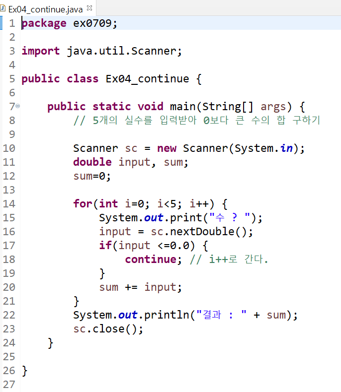 continue; // 0보다 작으면 i++로 간다. 즉 밑에 더하기를 실행하지 않음.