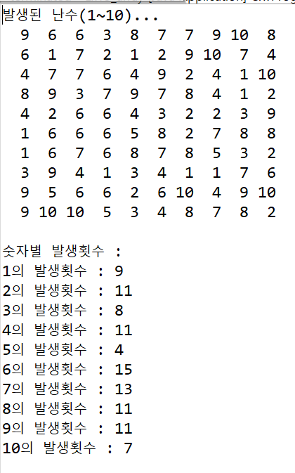 1~10까지 난수를 100개 발생시켜 한 줄에 10개씩 출력하고 마지막에 각 숫자별 발생 횟수를 출력하는 프로그램을 작성