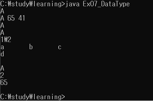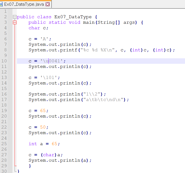 c = '\101'; //8진수 유니코드를 나타냄. (8진수 101은 10진수로 65)