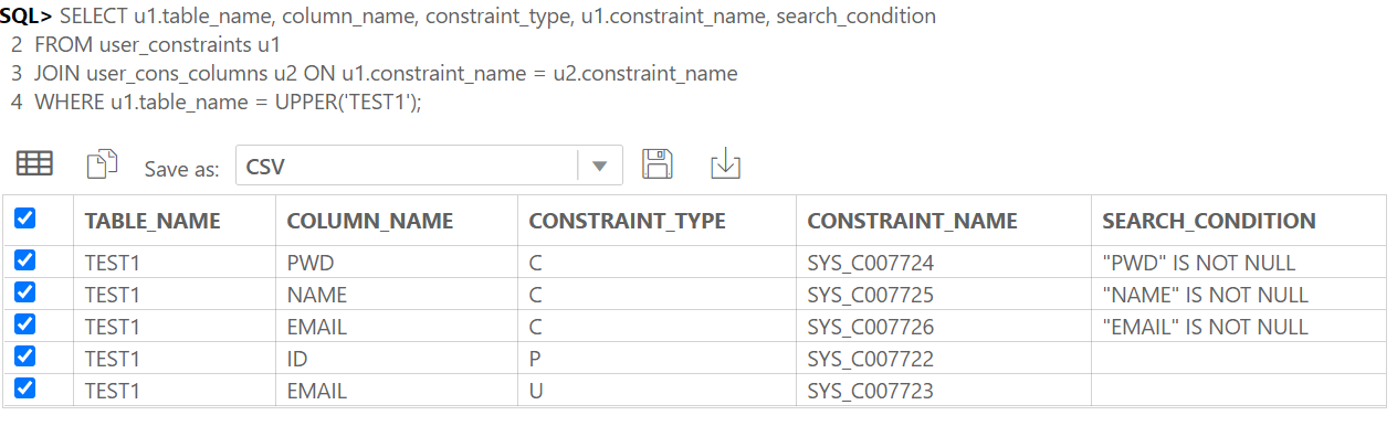 SELECT * FROM USER_CONSTRAINTS WHERE table_name= 'TEST1';