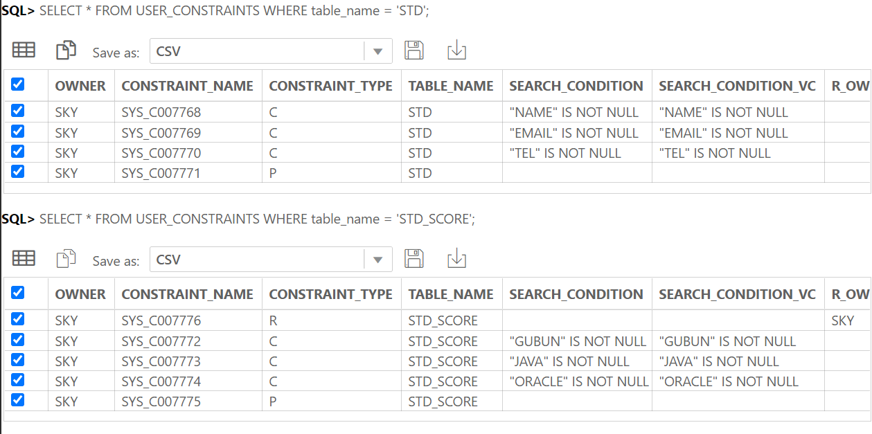 CONSTRAINT [제약조건명] 을 통해 기본키와 UNIQUE에 이름을 주어서 SELECT * FROM USER_CONSTRAINT WHERE table_name = 'TEST1'; 을 통해 알아볼 수 있었다. 이 명령어를 통해 보면 CONSTRAINT_TYPE에 P가 PRIMARY KEY를 나타내고, U가 UNIQUE를 나타낸다. C는 CHECK 제약조건.